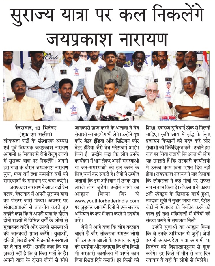 Mr. Narayan also launched two websites - www.youthforbetterindia.com and www.citizensforbetterindia.com and called upon people and youth to highlight any discrepancies they noticed about food adulteration, irregularities in petrol bunks etc., and partner with Lok Satta in finding solutions to the problems. Though the Surajya Yatra was confined to the two Telugu States, the issues taken up were of universal importance and all political parties and States could implement the objectives of Yatra in their own States.