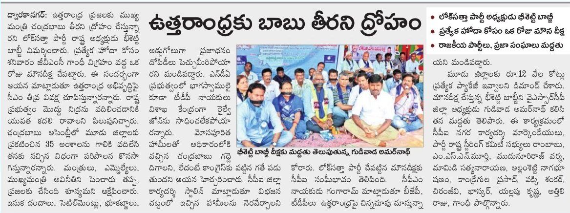 పాలకుల తీరును ప్రశ్నించాలి - లోక్ సత్తా పార్టీ రాష్ట్ర అధ్యక్షుడు భీశెట్టి మౌనదీక్ష Monday, February 20, 2017 - 21:04