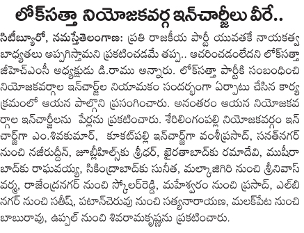 లోక్ సత్తా నియోజకవర్గ ఇన్ చార్జీలు వీరే..
