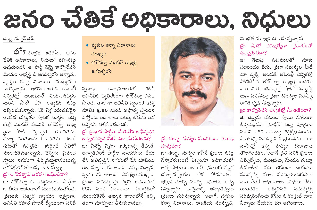 Q. Loksatta's thrust has always been citizen's driven clean politics for better governance? What does it mean in real terms and how do you look at it electorally?