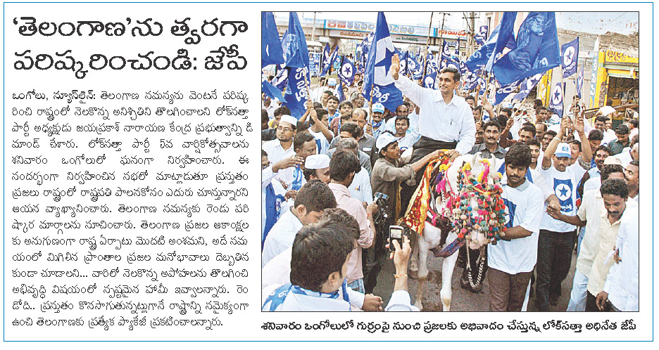 'తెలంగాణా'ను త్వరగా పరిష్కరించండి: జేపీ