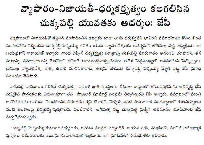 వ్యాపారం-నిజాయతీ-ధర్మకర్తృత్వం కలగలిసిన చుక్కపల్లి యువతకు ఆదర్శం: జేపీ