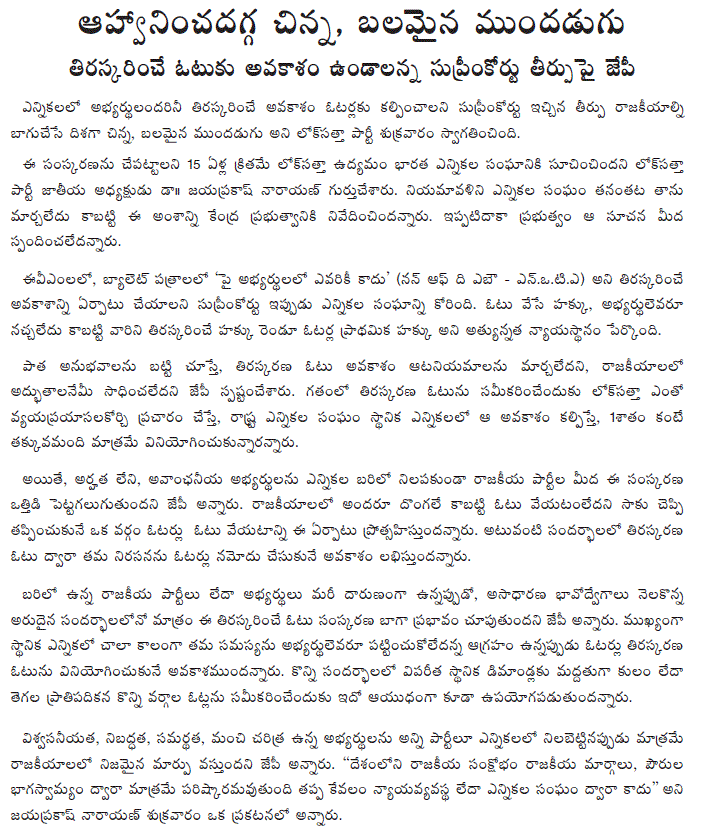 A lot more remains to be done to transform our politics, governance and economy. Proportional representation system, strong and empowered local governments, independent and effective anti-corruption institutions, and service guarantees law are the most important changes required to make our politics an instrument to improve the lot of the people. Lok Satta is dedicated to creating new politics to a new generation of Indians, and will pursue these goals steadfastly over the next few years, Dr JP said.