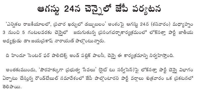 The Centre for Civil Society (CCS) is organizing its Freedom Caravan program in Hyderabad on August 26 and 27 in association with the Lok Satta movement.