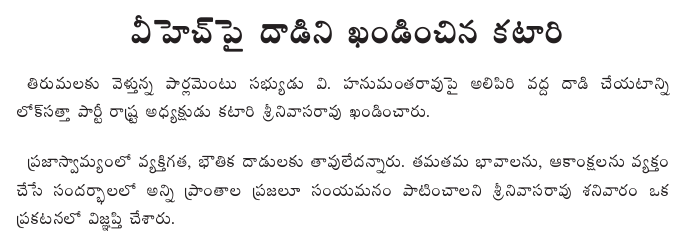 Lok Satta Party State President Katari Srinivasa Rao today condemned the attack on Mr. V. Hanumantha Rao, MP, at Alipiri as he was on his way to Tirumala.