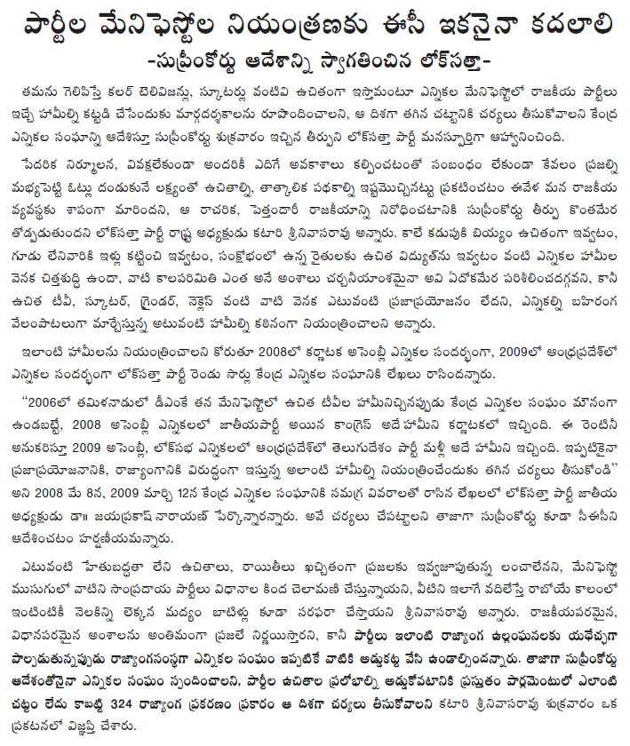 The established political parties are increasingly adopting the path of making unethical and irresponsible poll promises which are tantamount to corrupt electoral practices. The print and electronic media have widely reported the Telugu Desam Party (TDP)’s draft manifesto (announced on 5th March, 2009; sample newspaper coverage enclosed) containing the poll promise of distributing free colour television sets to voters. Such a reckless and irresponsible electoral promise has crossed all bounds of acceptable political campaigning. Distribution of free colour TVs with public resources cannot be regarded as legitimate public policy, by any standard.