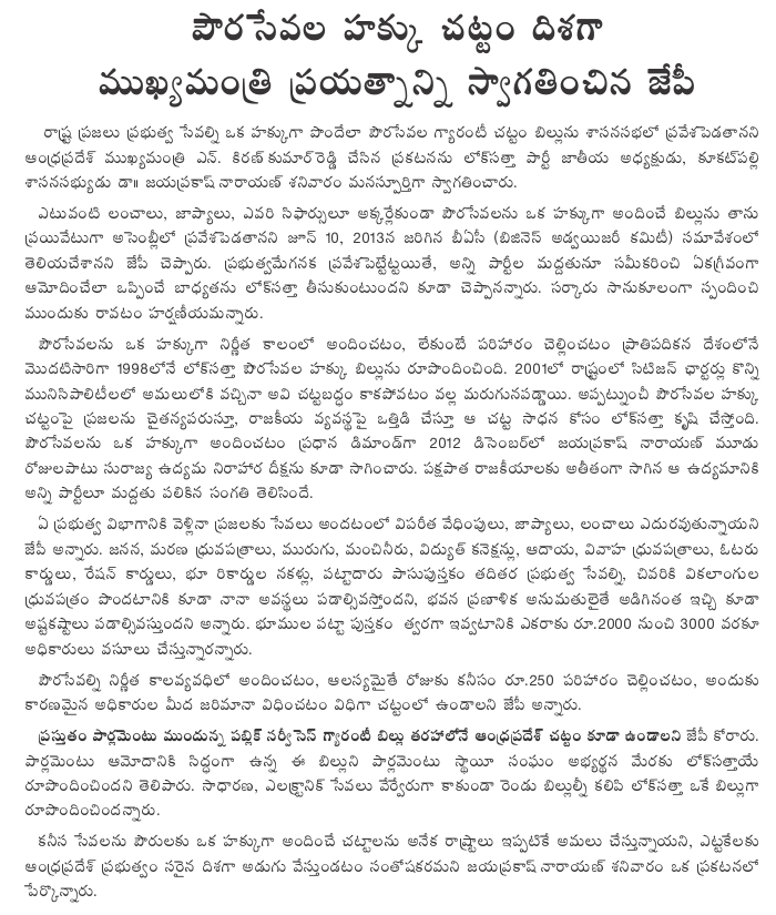 Lok Satta Party national President Dr. Jayaprakash Narayan today wholeheartedly welcomed Andhra Pradesh Chief Minister N. Kiran Kumar Reddy’s announcement of his intention to introduce a Public Services Delivery Bill in the Legislature.