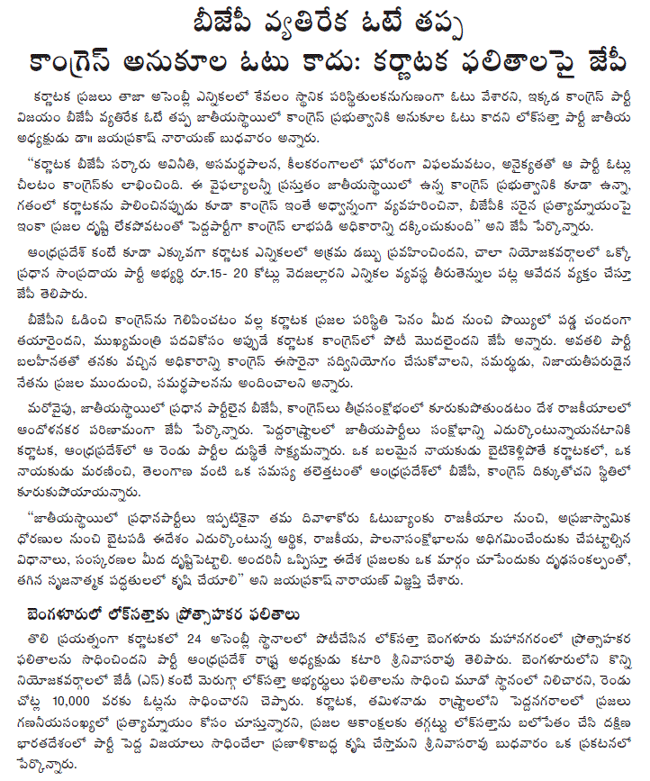 Dr. JP said that by defeating the BJP and voting for the Congress, the people in Karnataka have fallen from the frying pan into the fire. A race has already begun in Karnataka for the Chief Minister's post. He hoped that the Congress which has won by default will utilize the opportunity to provide good governance by choosing a person of integrity and competence as Chief Minister.