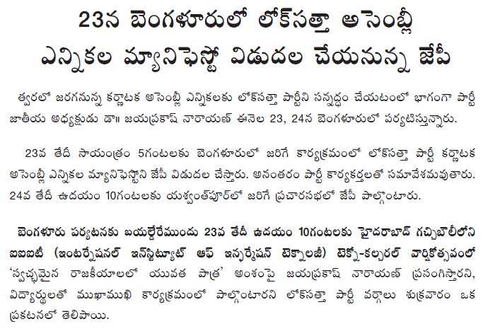 Lok Satta Party national President Dr. Jayaprakash Narayan gave this information in a media statement here today. During his visit to New Delhi on February 19 and 20, Dr. JP met a number of key people in the Government and political parties seeking their support for electoral, judicial and panchayat raj reforms and Bills.