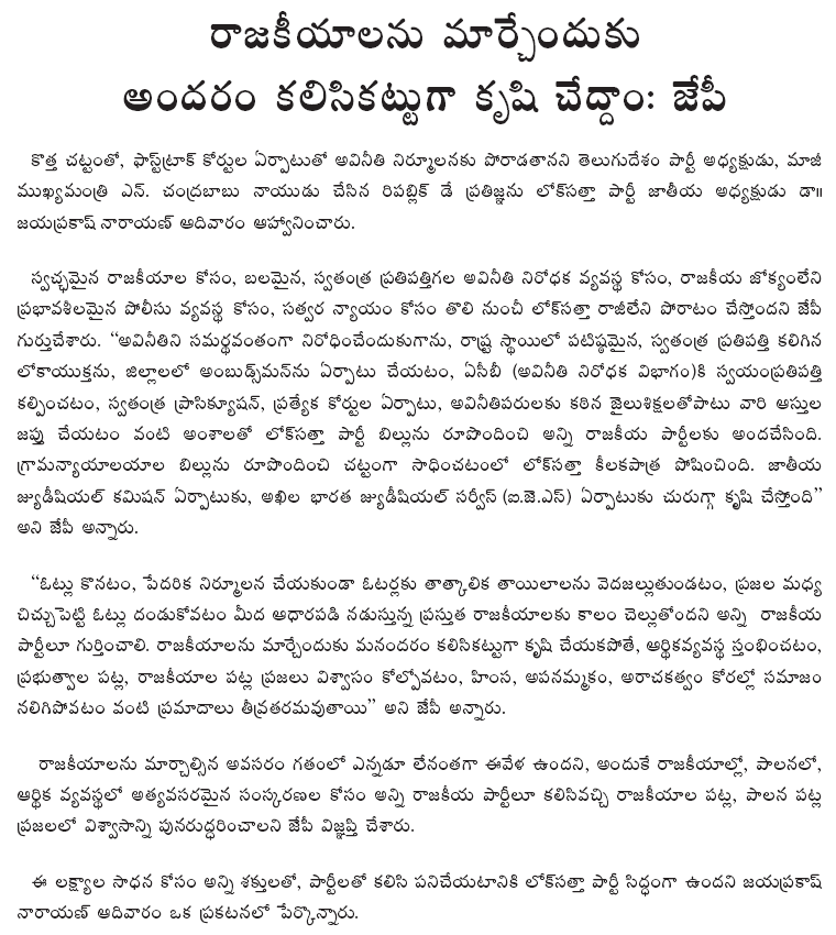 "Instead of respecting cooperatives as vibrant farmers' organizations and empowering them, they are controlled by the Government and used for partisan politics. It is time all of us together changed the situation," added the Lok Satta leaders.