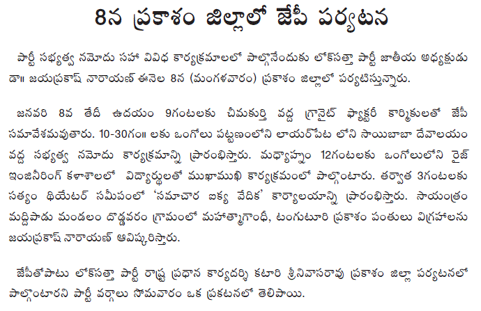 Dr. JP will be addressing Indian Student Parliament on ‘Youth for integrity and efficiency’ at MIT school of Government, Pune, on January 12. Dr.JP will also be visiting Adele village in Pune district which elected Lok Satta candidates in six of the nine wards of the Panchayat.