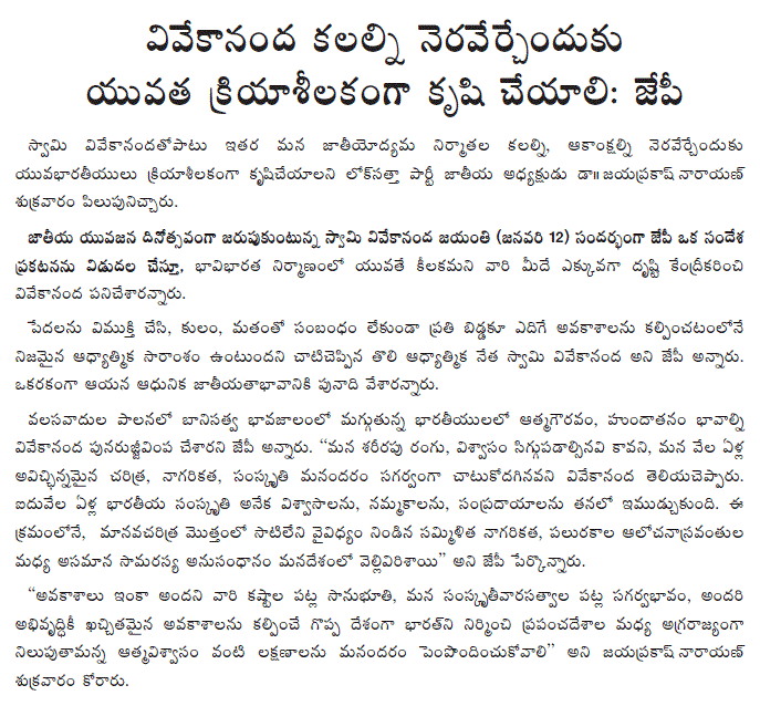 In a message on the eve of the birth anniversary of Swami Vivekananda which is celebrated as National Youth Day, Dr. JP recalled that Vivekananda focused on youth as the fountainhead of the future.