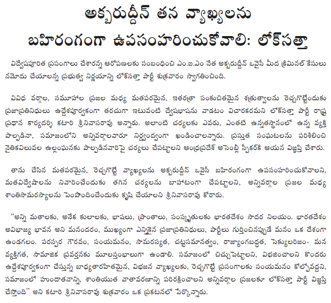 The note to the committee was signed by Lok Satta Party’s national President Dr. Jayaprakash Narayan, Ms. Elizabeth Seshadri, eminent advocate and Treasurer, Lok Satta Party, Chennai, Ms. Jamuna, SERP Coordinator, Ms. Tara Krishnaswamy, advisory committee member, Karnataka, Ms. Ankita, advocate, Ms. Hyma Praveen, Lok Satta in-charge, Sanathnagar, Hyderabad, Ms. Saroja, Mahila Satta leader, Ms. Shantala Damle, Lok Satta incharge, Baswanagudi constituency, Karnataka , Mr.Sudhakar, executive member, Lok Satta Party and Lok Satta Research Team.