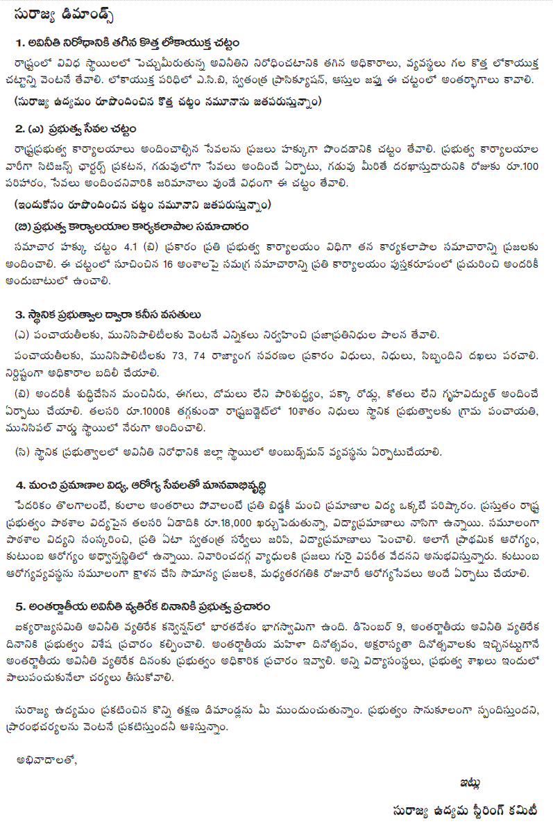 Given the non-partisan and constructive approach of Surajya Movement, and given your role as an elected legislator for the Andhra Pradesh State, we appeal to you to take up the movement’s goals and objectives in various and appropriate forums in the coming days and weeks.