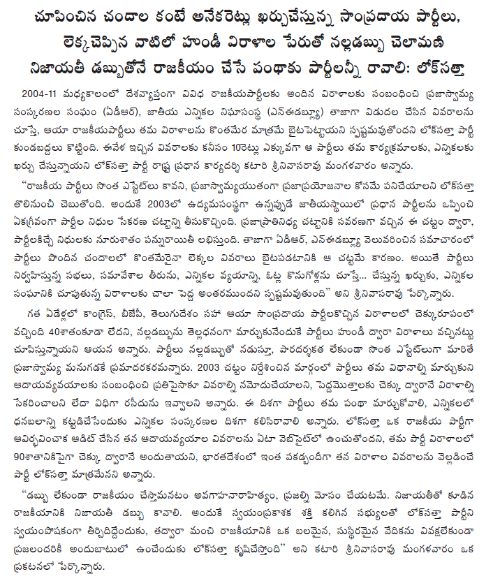 Commenting on the report released by the Association for Democratic Reforms and the National Election Watch, Lok Satta Party General Secretary Katari Srinivasa Rao pointed out that going by the expenses the traditional parties incur on rallies and conferences, election campaigning and vote purchases, they seem to be reporting just one-tenth of their collections.