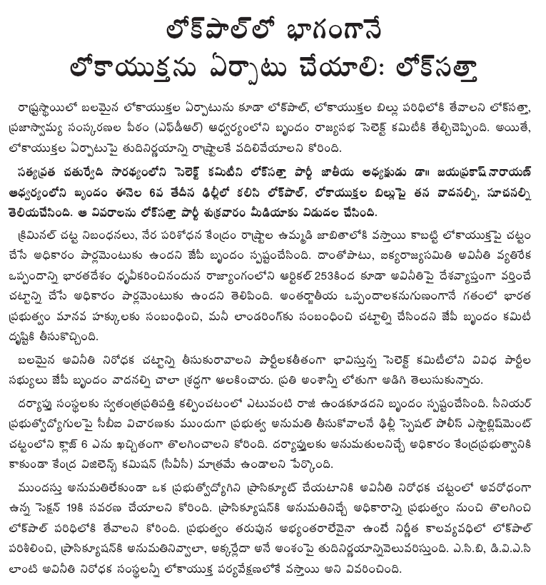 The delegation, led by Lok Satta Party national President Dr. Jayaprakash Narayan impressed upon the committee headed by Mr. Satyavrat Chaturvedi that Parliament has power to legislate upon Lokayukta, considering that criminal law procedures and crime investigation come under Concurrent jurisdiction of the Center and States. Again under Article 253 of the Constitution, the Government of India is entitled to pass a law on corruption applicable throughout the country as it has become a signatory to the United Nations' Convention against Corruption. The Union Government had in the past adopted Acts on human rights and money laundering applicable throughout the country in accordance with international treaties.