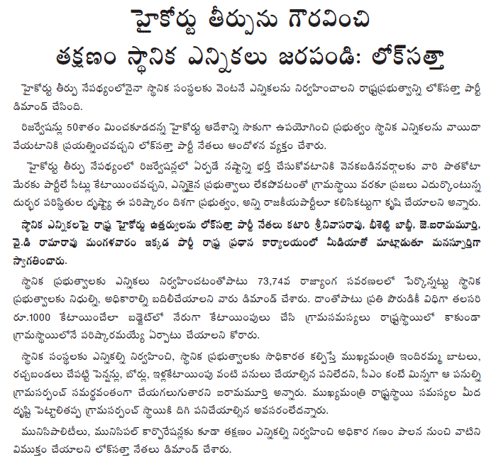 The team calling on the Select Committee includes Mr. Arif Mohd. Khan (former union minister), Mr. K.N. Govindacharya (Save Democracy Front), Dr Ashwin Mahesh, (Lok Satta, Karnataka), Ms Ankita Verma (Lok Satta, Mumbai), Mr. Anurag Kejriwal (Lok Satta, Delhi), Mr. Senthil Kumar Arumugam (Lok Satta, Tamil Nadu), Mr. Sandeep Verma ( Lok Satta, Delhi), Mr. Surendra Srivastava (Lok Satta, Maharashtra), and Ms Tara Krishnaswamy (Lok Satta, Bangalore).