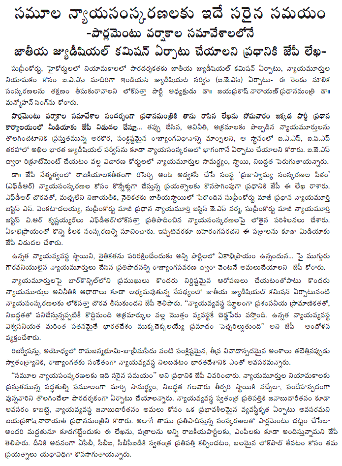 In reply to a question on the Government decision on tuition fee reimbursement for professional college students, Dr. JP recalled that it was the Lok Satta Party which had for the first time declared that no student who is eligible and has the desire to pursue higher education be denied the opportunity on the ground that he or she has no resources. It was one of the 50 guarantees the Lok Satta Party incorporated in its election manifesto in 2009. Being smarter than most others, the then Chief Minister Dr. Y. S. Rajasekhara Reddy chose to implement it. The Lok Satta Party welcomed the decision.