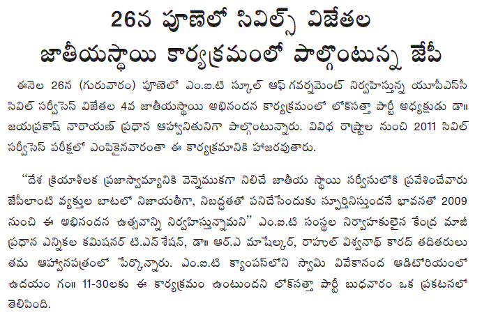 Lok Satta Party President Dr. Jayaprakash Narayan will be addressing a national-level function being held in Pune on July 26 to felicitate successful candidates in the 2011 UPSC Civil Services Examination.