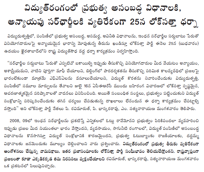 The Lok Satta Party is organizing a dharna at Vidyut Soudha in Hyderabad on the morning of Wednesday, July 25 to protest against State Government punishing power consumers by imposing fuel surcharge adjustment (FSA) charges. The FSA imposition is meant to cover up its inefficient, irrational and corrupt policies in generation, transmission and distribution of power.