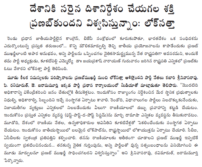 Lok Satta Party leaders Katari Srinivasa Rao and Mr. P. Ravi Maruth told a media meet that the party expects Mr. Pranab Mukherjee to take the lead in addressing three vital problems. The first is empowerment of local bodies as envisaged in the Constitution with devolution of powers, resources and personnel on them. The second is a through overhaul of the present first-past-the-post electoral system which has unleashed politics of money power and is coming in the way of honest people and parties contesting elections. A switchover to the proportional representation system will eliminate the influence of money in eections to a large extent. The third is liberation of the country from political and official corruption. It calls for creation of powerful and independent mechanisms of Lokpal and Lokayuktas and grant of autonomy to investigative agencies like the CBI and ACBs.