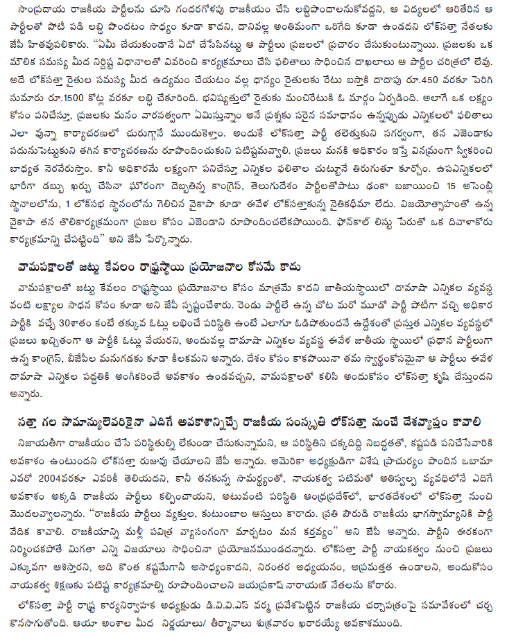 Replying to a question on Rayala Telangana, Dr. JP said that the Lok Satta would welcome Telangana emerging as part of a comprehensive and amicable solution after thorough discussions.