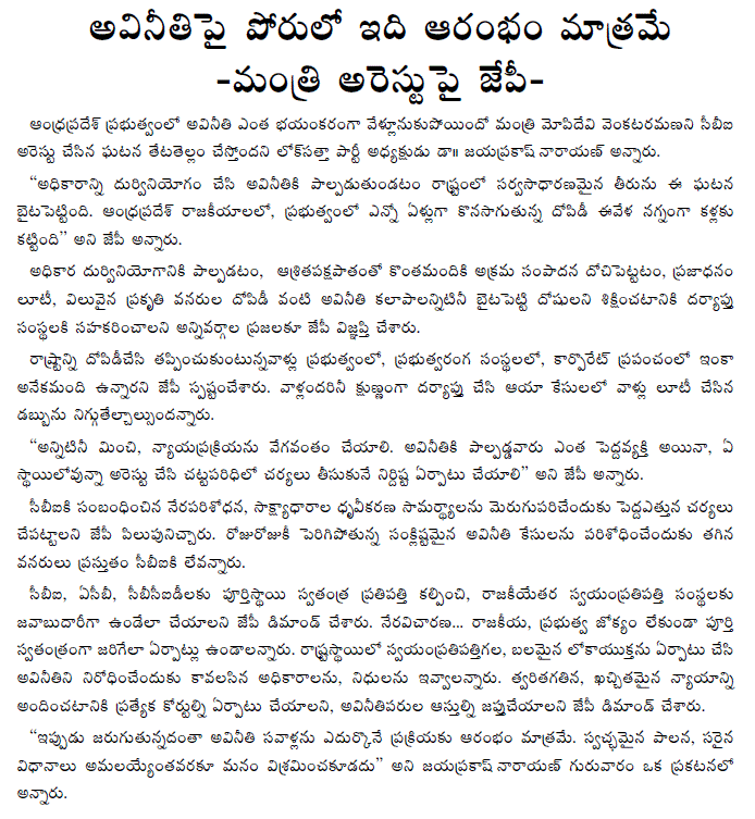 Sharply reacting to Team Anna’s demand for an inquiry by a panel of judges into allegations against Prime Minister Dr. Manmohan Singh and 14 other Union Ministers, Dr. JP said in a media statement that assuming every one is corrupt and every Government decision is tainted with corruption unless otherwise proved is a sure recipe for disaster.