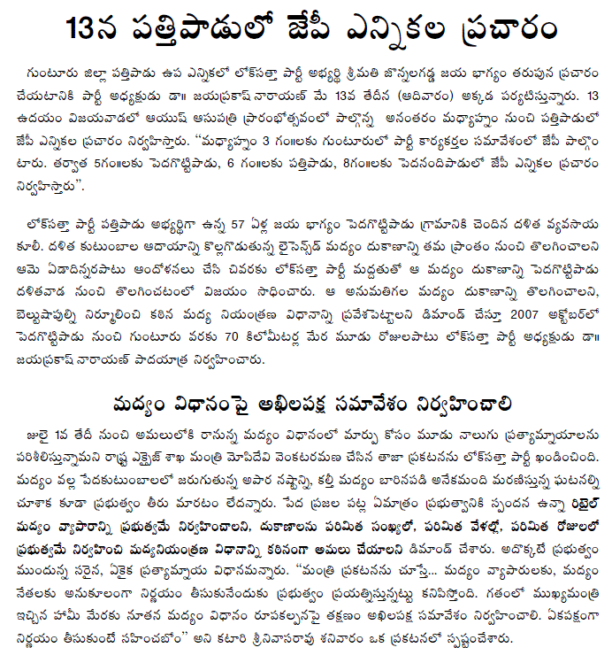 Greeting people on the diamond jubilee of Parliament, Dr. JP said in a media statement that people should ponder over means of electing educated, erudite and humble representatives to legislatures. The first Parliament of 1952 contributed to healthy discussions because it included a large number of people who fought for freedom, nation building, and formation of constitutional bodies. How could people of integrity get elected to the legislature these days when two or three parties spend a total of about Rs.30 crore for a by-election to the Assembly, asked Dr. JP.
