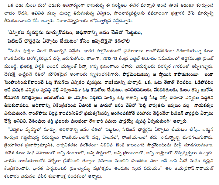 Dr. JP said that the present first-past-the-post electoral system is resulting in unbridled purchase of votes and grant of party tickets to corrupt and criminal elements. A switch-over to a proportional system of representation, decentralization of power and introduction of citizens' charters would free politics from corruption.