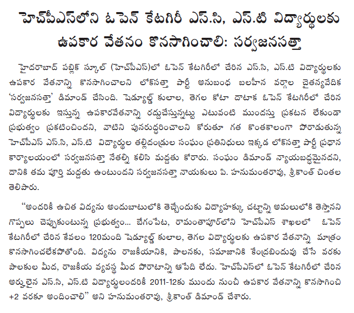 Lok Satta Party President Dr. Jayaprakash Narayan today counseled party leaders from Telangana to make it clear to people that the party is in favor of a Telangana State emerging as part of a comprehensive and amicable solution and that it alone has clear-cut policies for the region’s all-round development. He added that people’s aspirations cannot be ignored for long in a democracy.