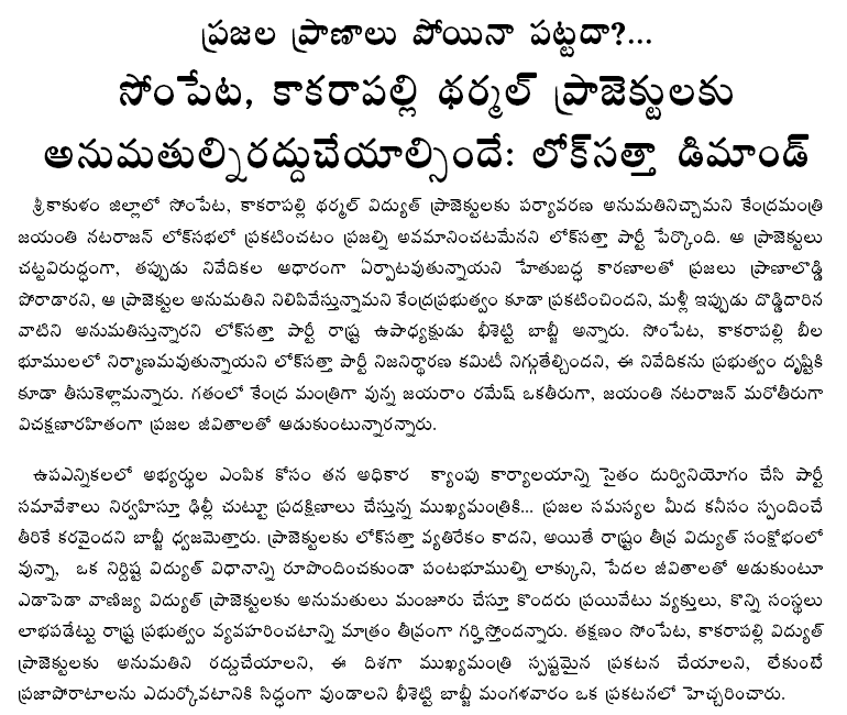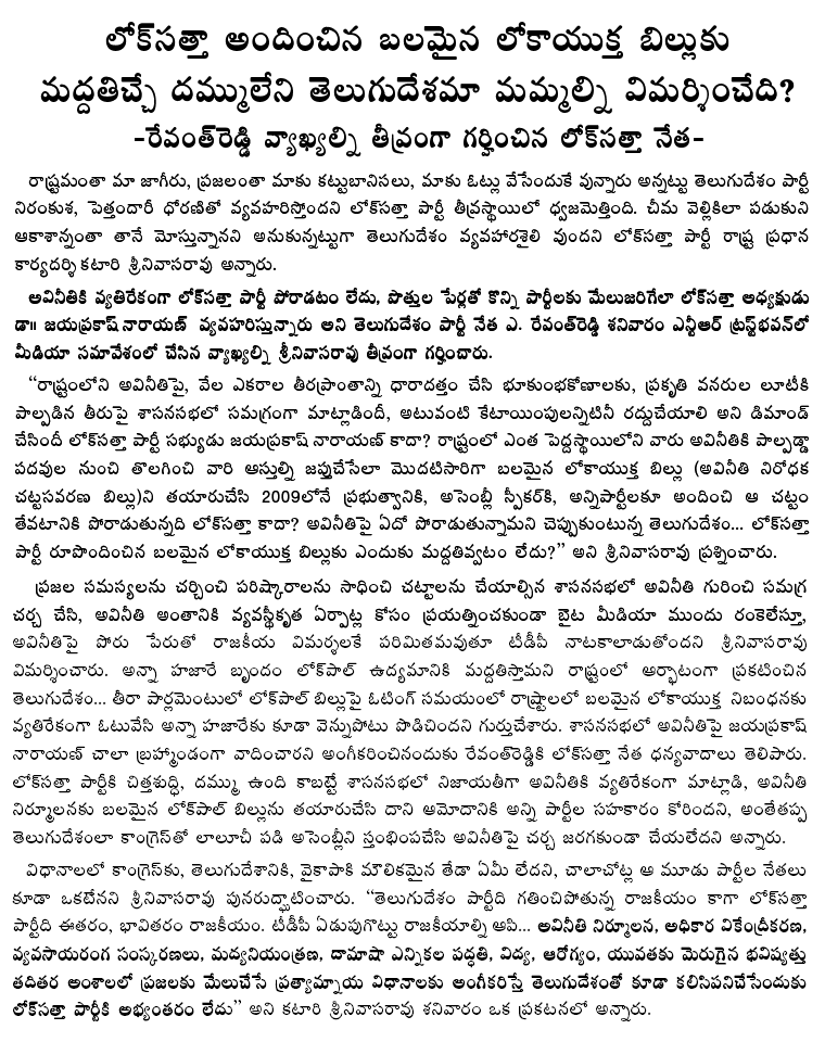 Mr. Varma pointed out that Left parties are divided on the Telangana issue while the Lok Satta has its own stand. It is also true there are differences of opinion between the Lok Satta and Left parties on many other issues. Yet, the Lok Satta believes it can work together with Left parties on public issues over which they shared a common view. Instead of confining itself to adjustments during elections for seats and votes, the Lok Satta will continue to work with like-minded parties on ushering in corruption-free politics and resolving people’s problems, Mr. Varma added.