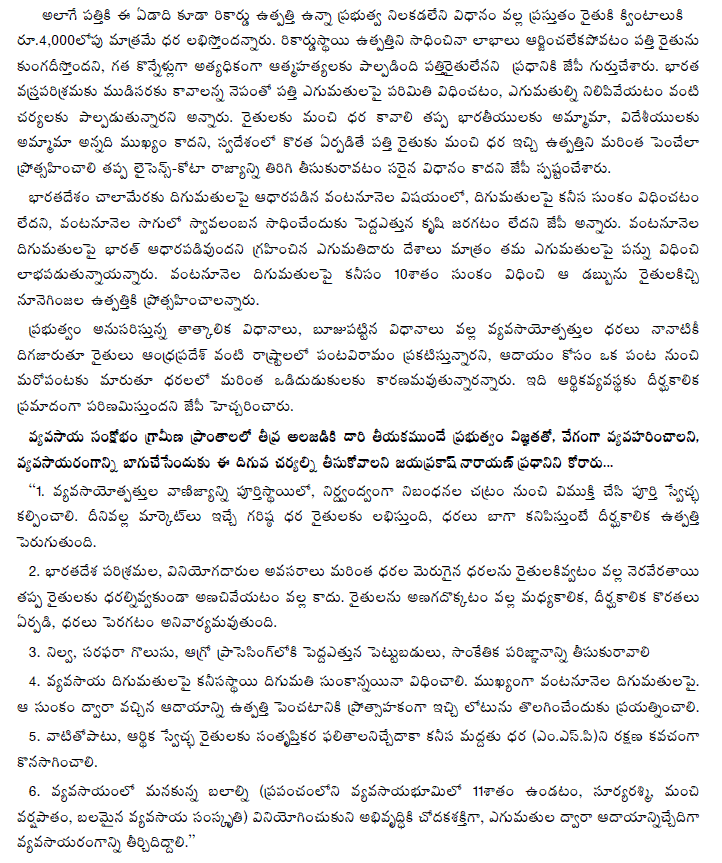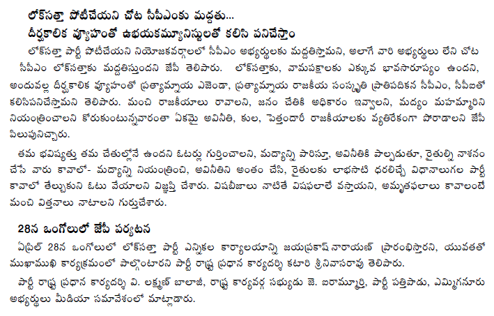 Dr. JP said that the Lok Satta Party and the CPI(M) would support each other in constituencies where they are not fielding candidates. He said the Lok Satta party looked forward to working with the Left parties on a long-term basis since they are on the same wavelength on many issues. The Lok Satta Party believes that all forces dedicated to clean politics, power to people and control of the liquor menace should come together and provide a viable alternative to politics of power brokers, corruption, casteism and cronyism.
