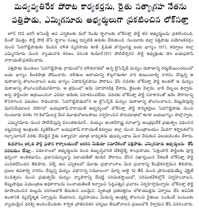 Lok Satta names an anti liquor activist and a Leader of farmers’ satyagraha as candidates
