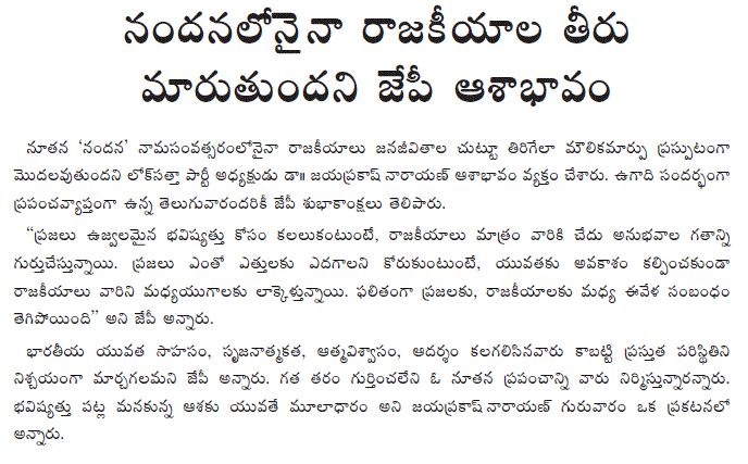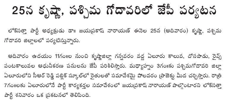 The Lok Satta would like legislators to discuss the issue keeping in mind the aspirations and fears of people of the two regions, work out a solution and make their recommendations to the Union Government. The Congress and the Telugu Desam Party should take the initiative and exert pressure on Delhi towards resolution of the problem.