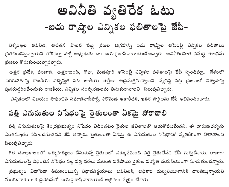 On March 10, Dr. JP will be undertaking a road show in Mahabubnagar town touching Padmavathi Colony, Teachers' Colony, Seshagutta, DK Colony, Marlu, Christianpally, Boyannathota and Rajendra Nagar.