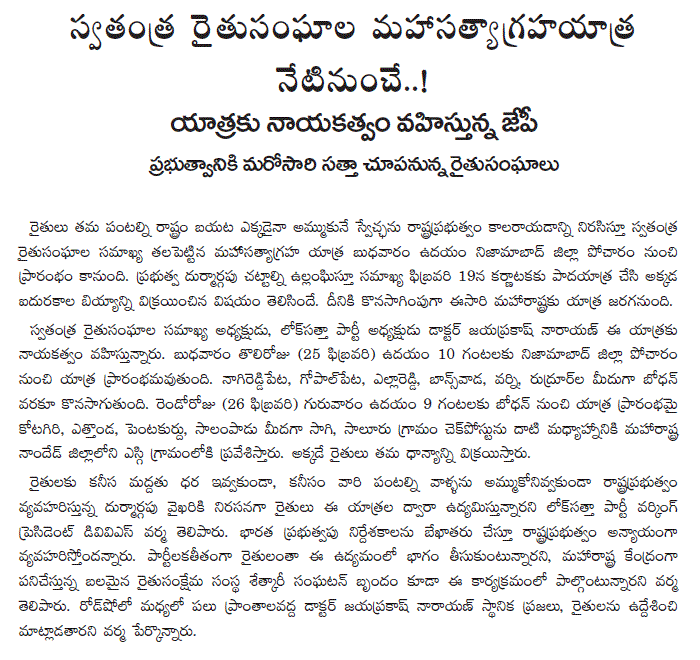 Dr. Jayaprakash Narayan, President of FIFA and the Lok Satta Party, will lead the satyagraha yatra from Pocharam village in Nizamabad district at 10-00 a.m. tomorrow.