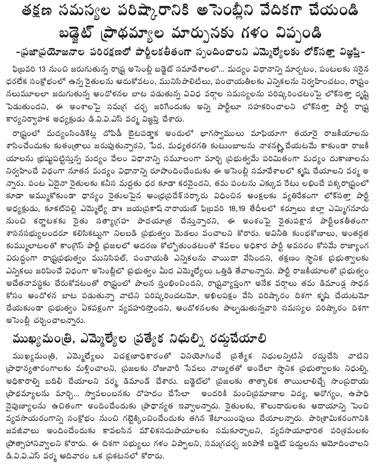 During the budget session of the Legislative Assembly beginning from February 13, the Lok Satta Party will focus its attention on the liquor policy, relief to the crisis-ridden farmer, elections to local bodies and resolution of issues raised by various sections.