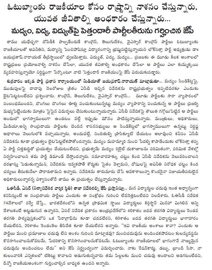 On liquor, Dr. JP referred to ACB raids on liquor syndicates in the State which revealed the nexus between them on the one hand and Ministers, officials, media and legislators belonging to all parties on the other. The Government has not made public the report, leave alone sanctioning prosecution of the guilty. Since the guilty belonged to all the traditional parties, they are maintaining a studied silence after muted protests initially.