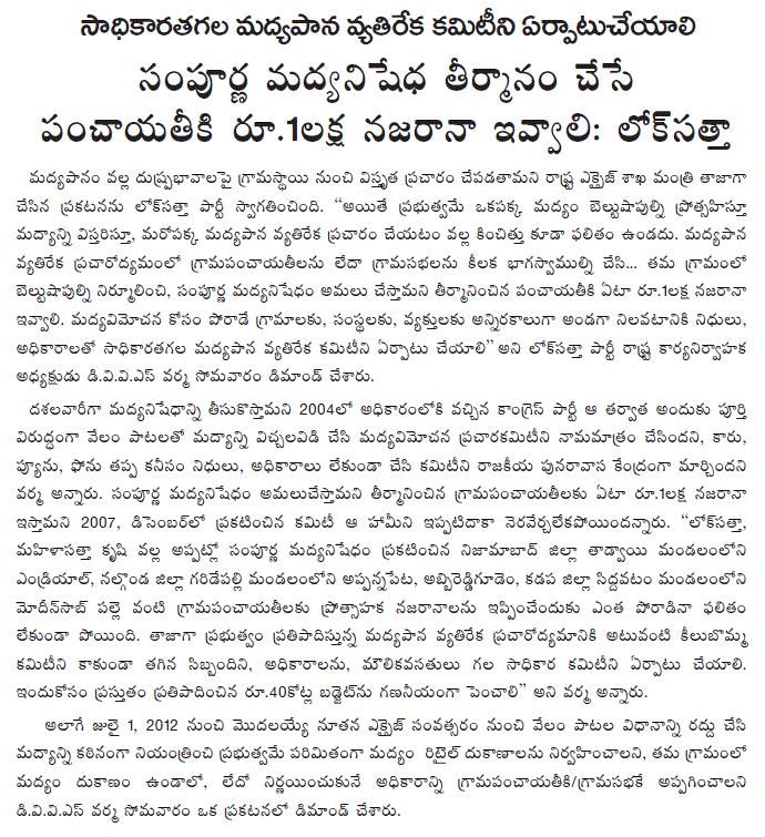 Mr. Varma recalled that the Congress Party, which returned to power in 2004 by promising to usher in Prohibition in phases, has done all that it could to encourage liquor consumption by auctioning liquor shops. Subsequently, it formed an anti liquor campaign committee devoid of powers and funds for rehabilitating some party workers. The committee did not fulfill its promise of granting a cash incentive of Rs.100000 to panchayats enforcing Prohibition although the Lok Satta submitted a list of such villages. If history were not to repeat itself, the Government should allocate more than Rs.40 crore for the proposed committee and confer adequate powers on it.