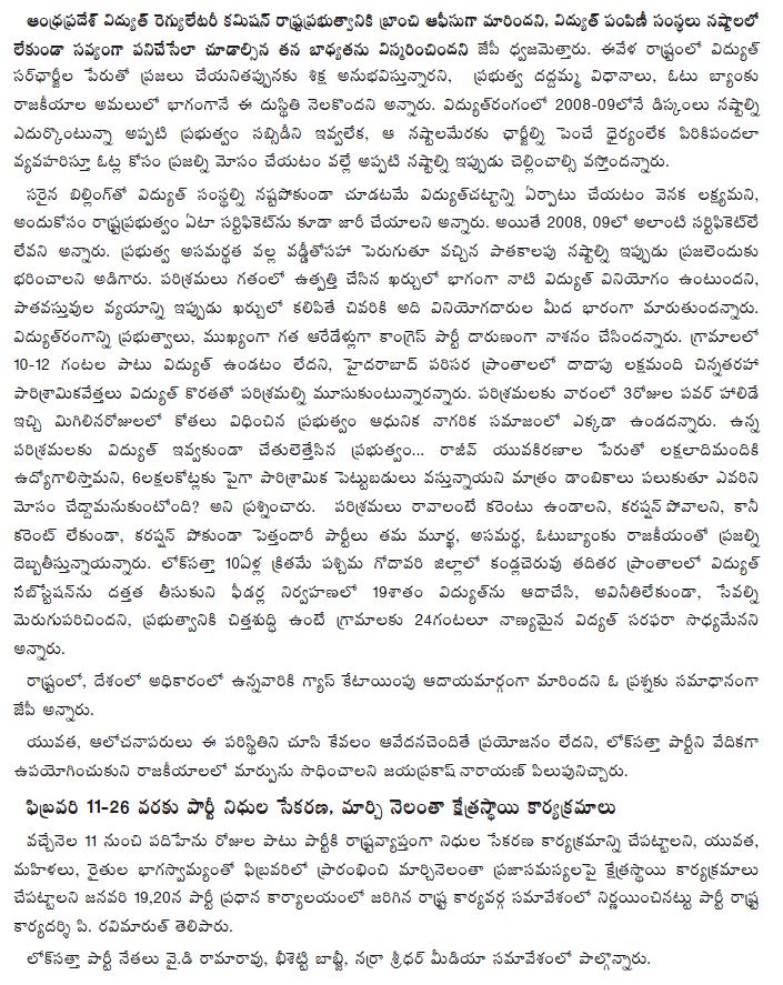 Dr. JP accused the Government of indulging in hypocrisy by claiming to attract investments worth lakhs of crores of rupees and provide jobs to tens of thousands of people even as it turns existing industries sick by starving them of power. The traditional parties continue to pursue bankrupt policies which will ensure darkness in our houses, and unemployment for our youth. Lok Satta has demonstrated what could be done by sensible management of power sector about a decade ago. In Kallacheruvu, in West Godavari district, Lok Satta franchisee managed a feeder line and saved 19% power, eliminated corruption, improved quality and showed the way of ensuring 24 hour power in all villages.