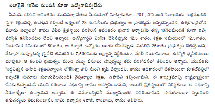 The scheme, a brainchild of the Chief Minister, aims at imparting skills and ensuring job placements to the unemployed youth. Going by industry estimates, the Chief Minister hopes to provide job opportunities to 15 lakh youth in the next three years, and at least one lakh by December 2011.