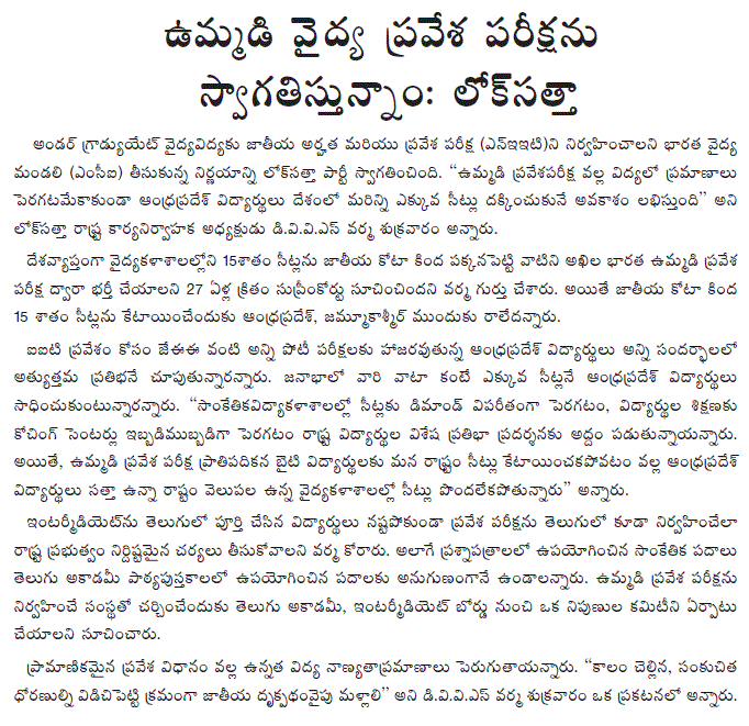 Lok Satta Party State Working President D. V. V. S. Varma today welcomed the Medical Council of India decision to conduct a National Eligibility and Entrance Test (NEET) for under-graduate medical education. “A common examination will not merely improve standards of education but also enable more Andhra Pradesh students to get medical seats in the country.”