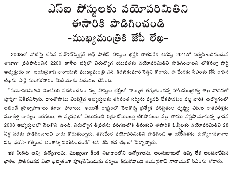 Lok Satta Party President has requested Chief Minister N. Kiran Kumar Reddy to concede the unemployed youth’s request for a one-time age relaxation for recruitment of sub-inspectors of police.