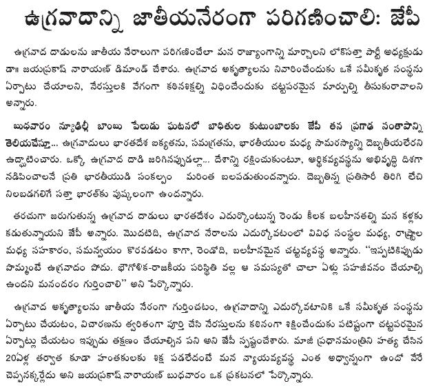 During his day-long visit to Krishna district, Dr. JP will be interacting with students of S. V. H. Engineering College in Machilipatnam, and Montessori Women’s College and Rotary youth in Vijayawada on tackling corruption.