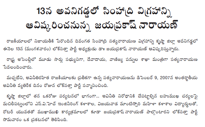 Lok Satta Party President Dr. Jayaprakash Narayan will be unveiling a statue of the late Simhadri Satyanarayana at Avanigadda in Krishna district tomorrow (Tuesday, Sep. 13).
