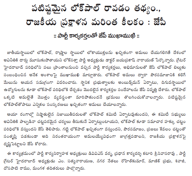 In a media statement issued here today, Mr. Varma pointed out that the Lok Satta has been fighting for the creation of an effective, strong, and independent Lokpal. It conducted two round table conferences in New Delhi and Hyderabad on the Lokpal Bill, brought about a consensus on most provisions, and communicated them to all political leaders in the form of amendments to the Union Government’s Bill.