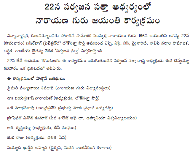 Sarva Jana Satta, Lok Satta Party’s wing for SC, ST, BC, EBC and Minorities, is celebrating the 156th birth anniversary of social reformer Narayana Guru at the Bhasheerbagh Press Club on Monday, August 22.
