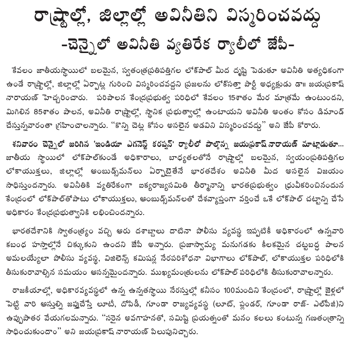 Taking part in an ‘India against Corruption’ rally in Chennai today, Dr. JP said that India could make a real dent in corruption if strong and independent Lokayuktas at the State level and Ombudsmen at the district level are instituted with the same powers, responsibilities as the Lokpal at the national level. With Government of India ratifying the United Nations Convention against Corruption, it is entitled to enact a Lokpal law applicable to the entire country providing for constitution of Lokayuktas and ombudsmen, along with the Lokpal.