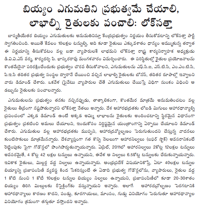 The Lok Satta leaders pointed out that farmers suffered because of ad hoc and fitful decisions on food grain exports. The Union Government should allow export of food grains, after ensuring national food security.