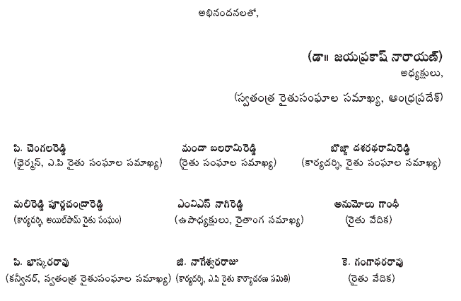 The Steering Committee comprises Messers R.Chengal Reddy, Y.Nagendra Nath, A.Prabhakar Reddy, Balarami Reddy, SP Shankar Reddy, Y.Pichhaiah Yadav, Dasaratharami Reddy, Siddha Reddy, Satya Vani, Kesava Reddy, Narasimha Reddy, Nageswara Raju, Nagi Reddy, Anamolu Gandhi and Kongara Gangadhara Rao. P. Bhaskara Rao is the convenor of the Committee.